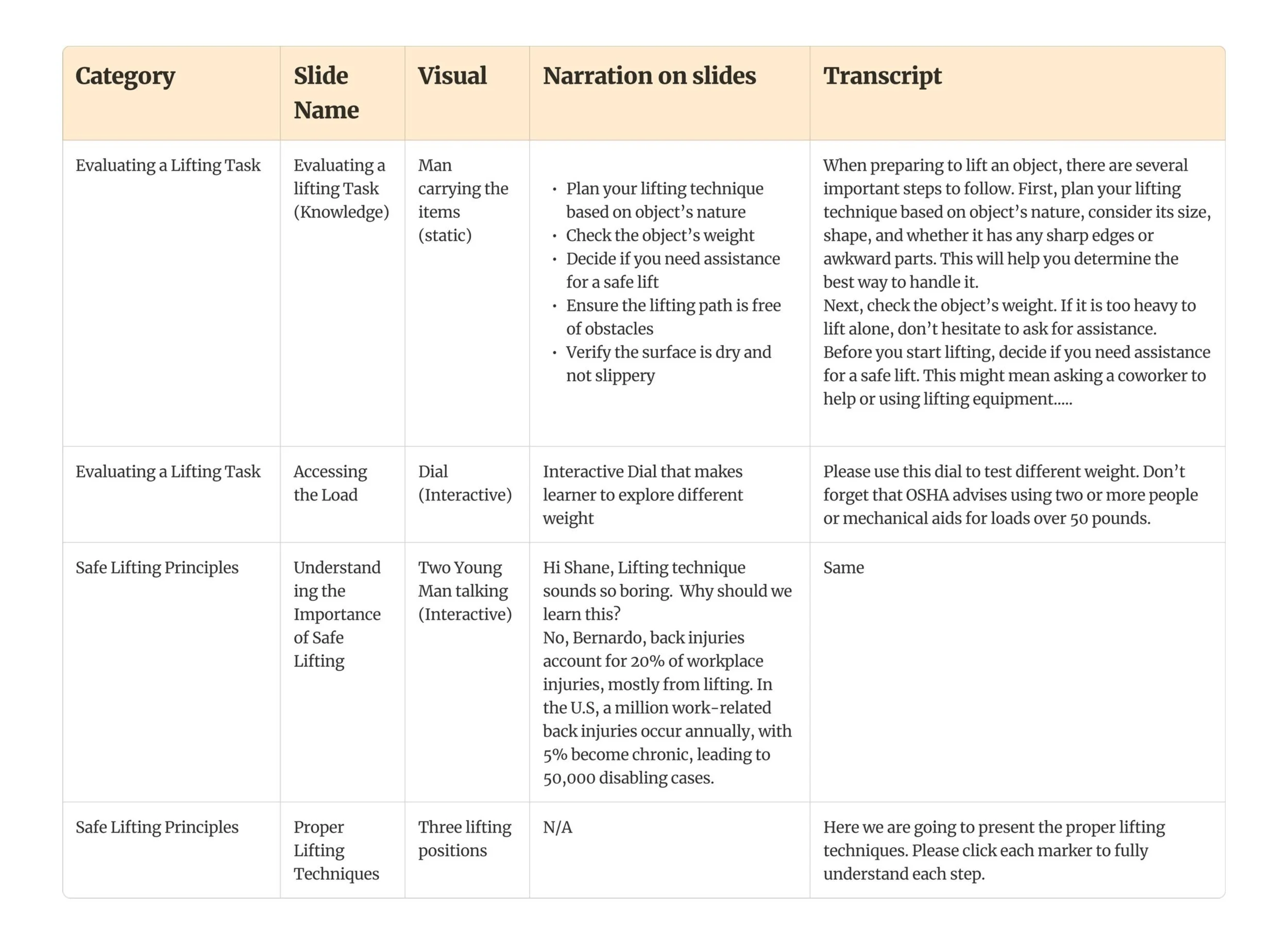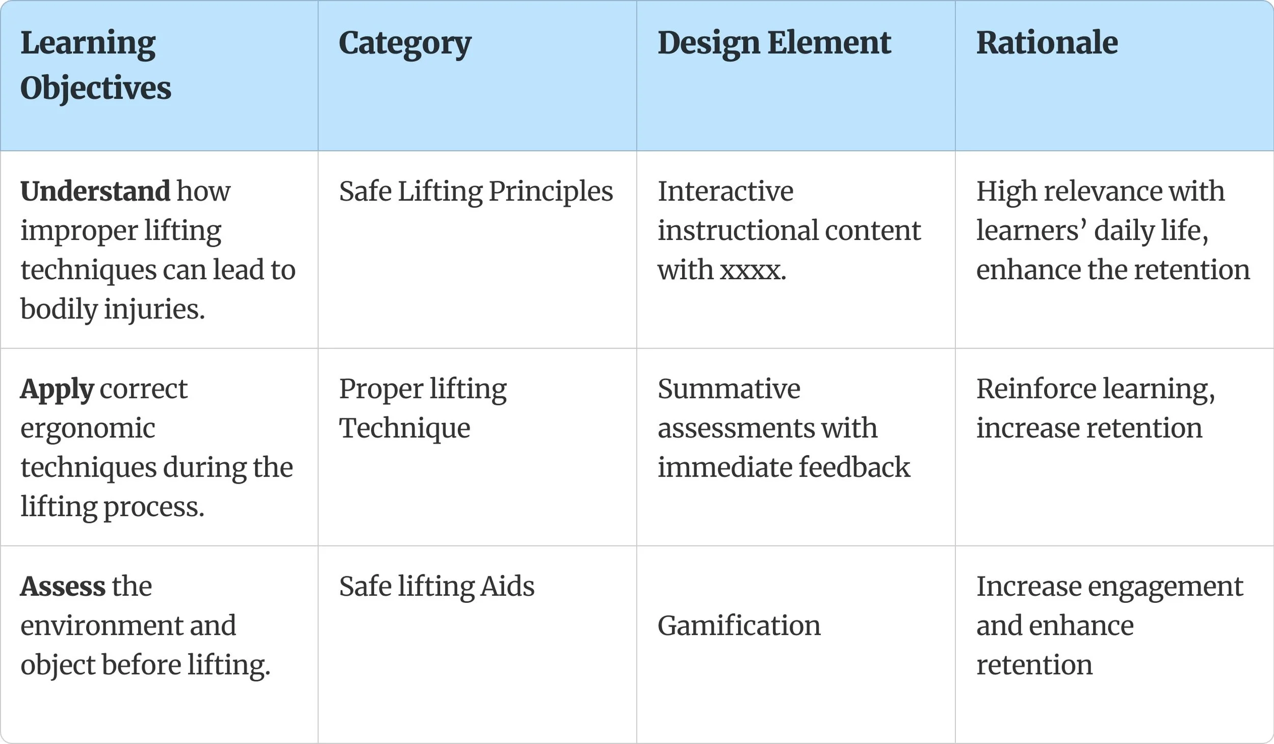 I developed a 20-to 30-minute interactive eLearning playlist to help employees understand the importance of safe lifting and learn how to apply safe lifting techniques in their work environment.